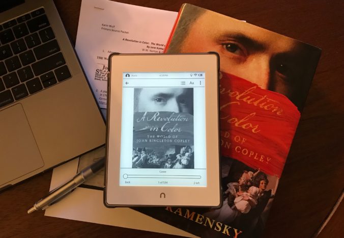 This week we’re discussing another book I have read in many formats and multiple times, and have gifted to friends and family, Jane Kamensky’s A Revolution in Color: The World of John Singleton Copley (W.W. Norton, 2016). One of the most powerful themes of the book is the often cruel vagaries of the eighteenth century, the ways that circumstance rather than innate qualities shaped lives then as it does now. Copley is known to us as a quintessentially American artist, and yet was as skeptical of American identity as he was loathe to assume it. How could he? He was a British subject, through and through. Copley’s astonishing ability to see foreground and background, what Kamensky calls his period-specific, bifocal “bivious gaze,” is plain from cover to cover. He watched England from Boston, and then America from London. He also offers a view that is at once passion and cool assessment. The lavish colors he employed, from Mercy Otis Warren’s unforgettable blue dress, to the arresting reds (Kamensky calls them “bricky”) of redcoats and robes, and drapery, tempt us to see a world either in intense motion or calm repose. There is Paul Revere (1768), with that steady gaze, and there is the water pulling Watson and the Shark tautly together.