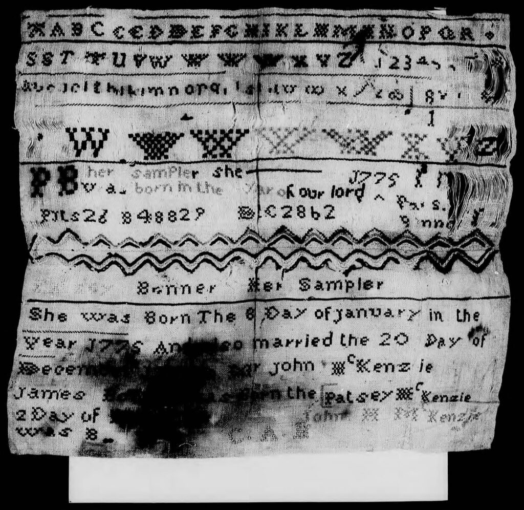 Laura probably worked the sampler around 1809, when she was 16 (the same age as her father when he enlisted), and later added another sibling along the bottom border. Family records were a regular theme for young women’s samplers in the very late 18th and into the 19th centuries, as documented by extraordinary scholarship including the pathbreaking work of Betty Ring. This one is one of a handful in the collections of the US National Archives that were submitted as evidence for pensions or other purposes (including land claims). Six illustrative examples appear on the NARA website, worked between 1787 and 1818, with birth and marriage dates. Other examples can be seen elsewhere in the files; though not all have color images, we can still appreciate their emotional texture.